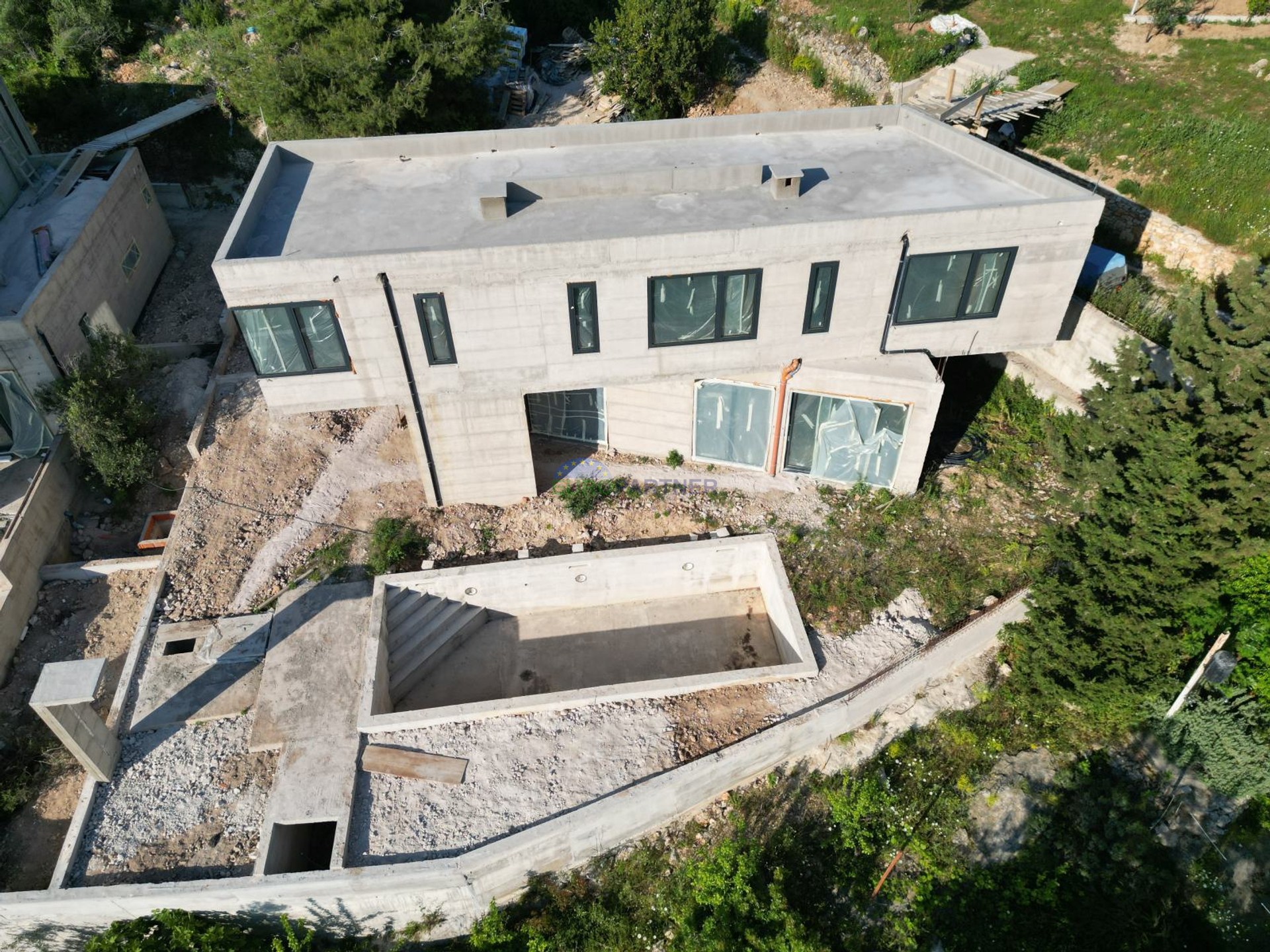 For sale is a modern villa with a swimming pool, on the car-free island of Prvić. The villa is built on a plot of land of 438 m2 and has a beautiful view of the sea and the surrounding islands. It consists of two floors, a ground floor and an upper floor. On the ground floor there is a kitchen, dining room, living room, bathroom, wellness room, covered and uncovered terrace, and a swimming pool of approx. 30 m2. On the first floor there is a hallway, 3 bedrooms, 3 bathrooms and an uncovered terrace. This property is under construction, and the current phase is the completion of concrete works, installation of aluminum openings and installations in the building. Since this is a car-free island, peace is guaranteed, but the execution of the works is very demanding. The island of Prvić is approx. 800 m from the mainland. It is famous for the fact that there are no cars on it, and it is also famous for Faust Vrančić, the inventor of the parachute and a Renaissance genius with many other inventions and ideas. The memorial center is located in Prvić Luka. The very beautiful nature without cars and the pleasant climate, in conjunction with good boat connections, certainly contribute greatly to a pleasant stay on this extremely attractive island.