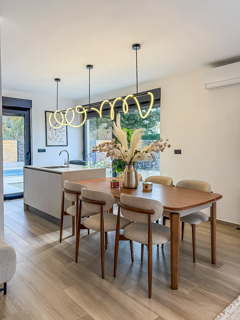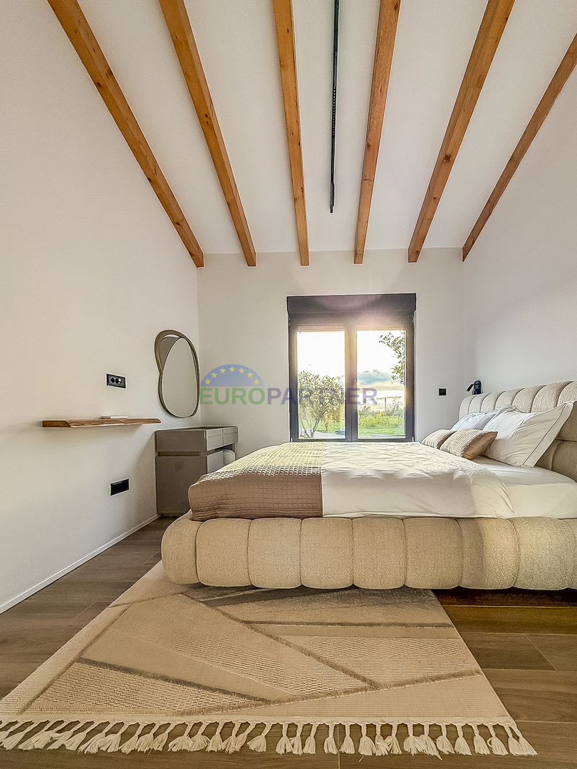 The living room opens onto a covered terrace with a summer kitchen and sauna, perfect for year-round enjoyment and socializing. In the beautifully landscaped yard there is a swimming pool with a sunbathing area, while the entire environment is enriched with Mediterranean plants that provide a feeling of Istria and home.