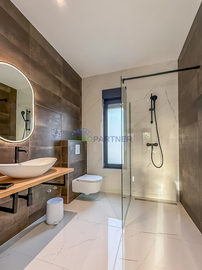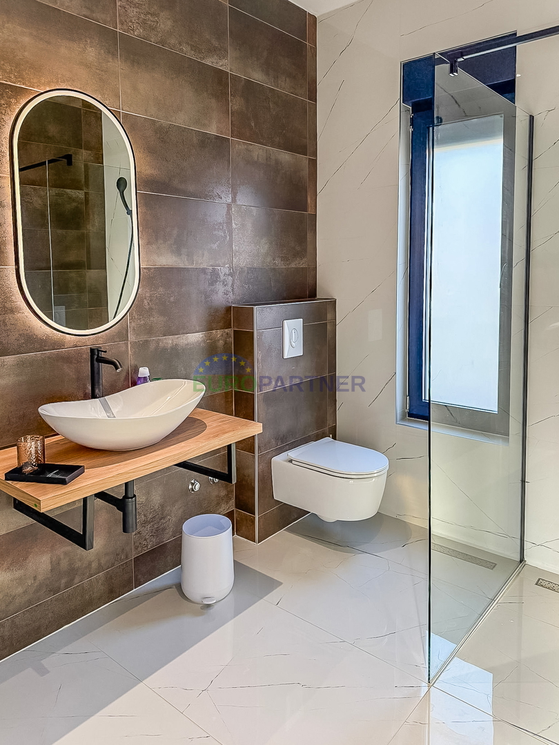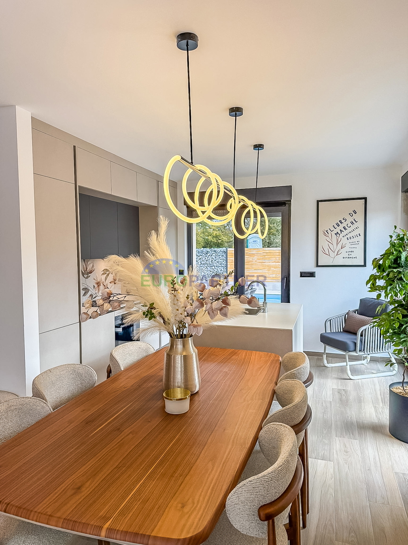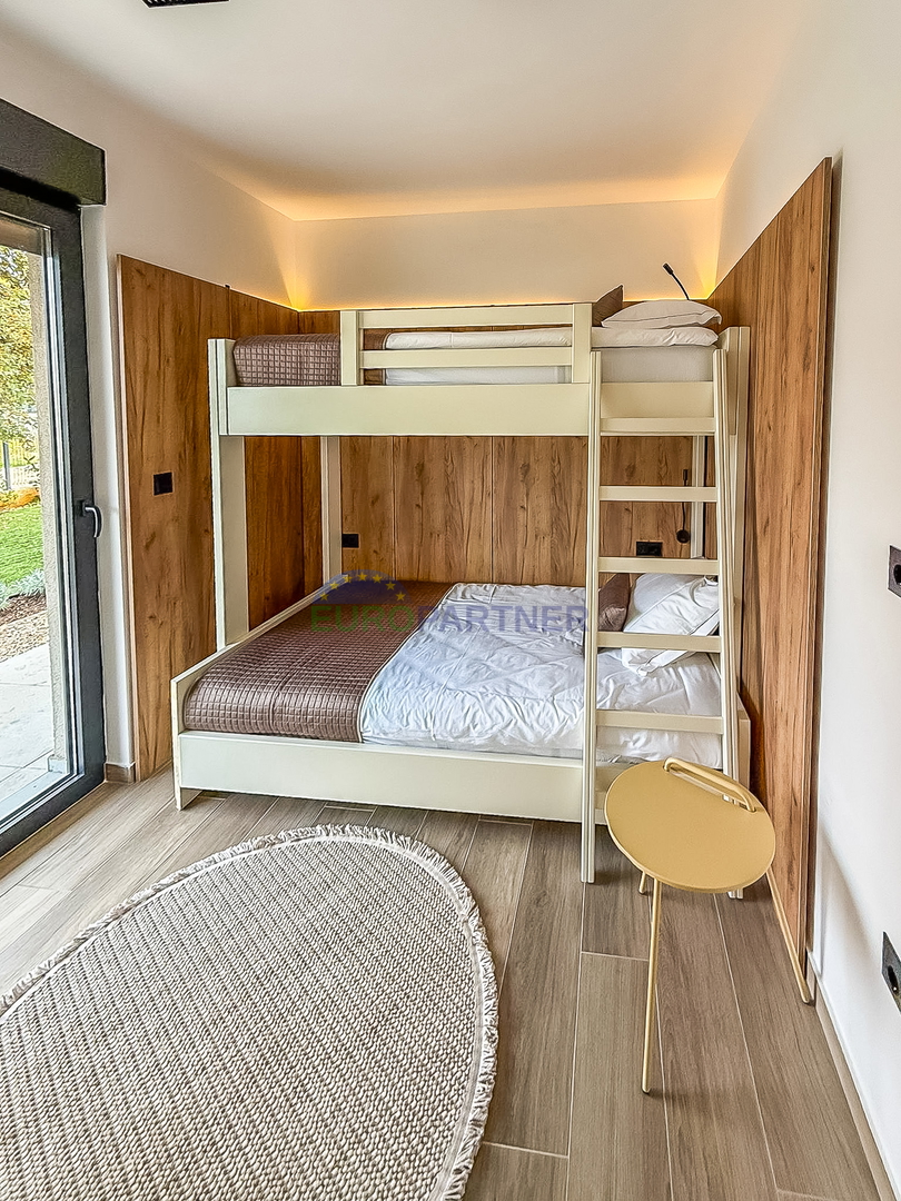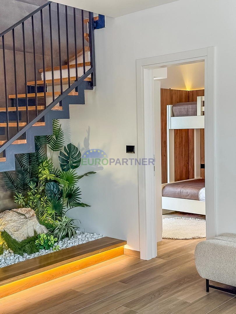 Upstairs there are two comfortable bedrooms, each with its own bathroom, an additional storage room and a spacious terrace ideal for relaxation. The house is fully equipped with carefully selected designer furniture that further emphasizes the elegance and modern character of the space.