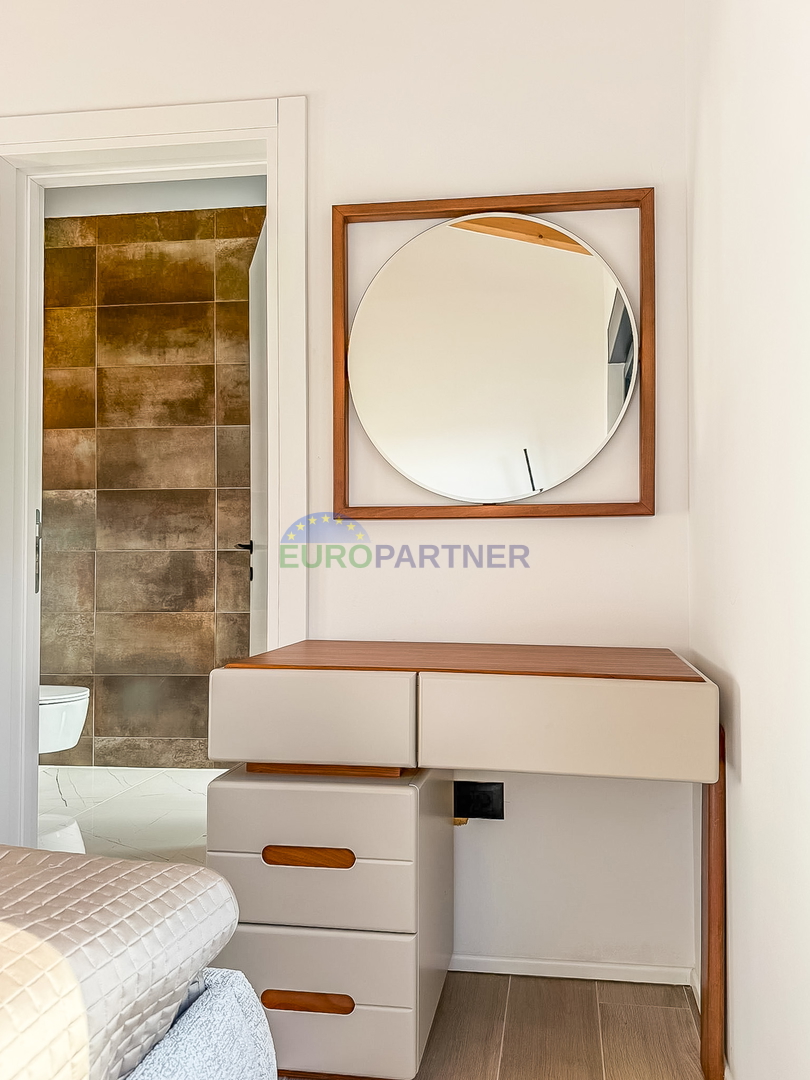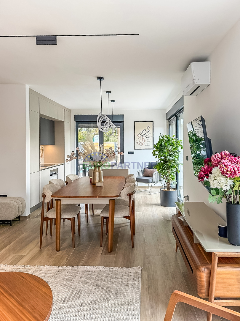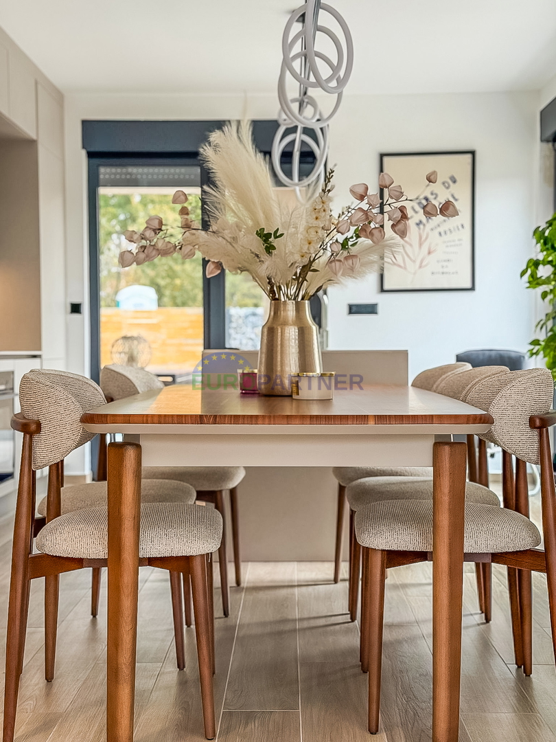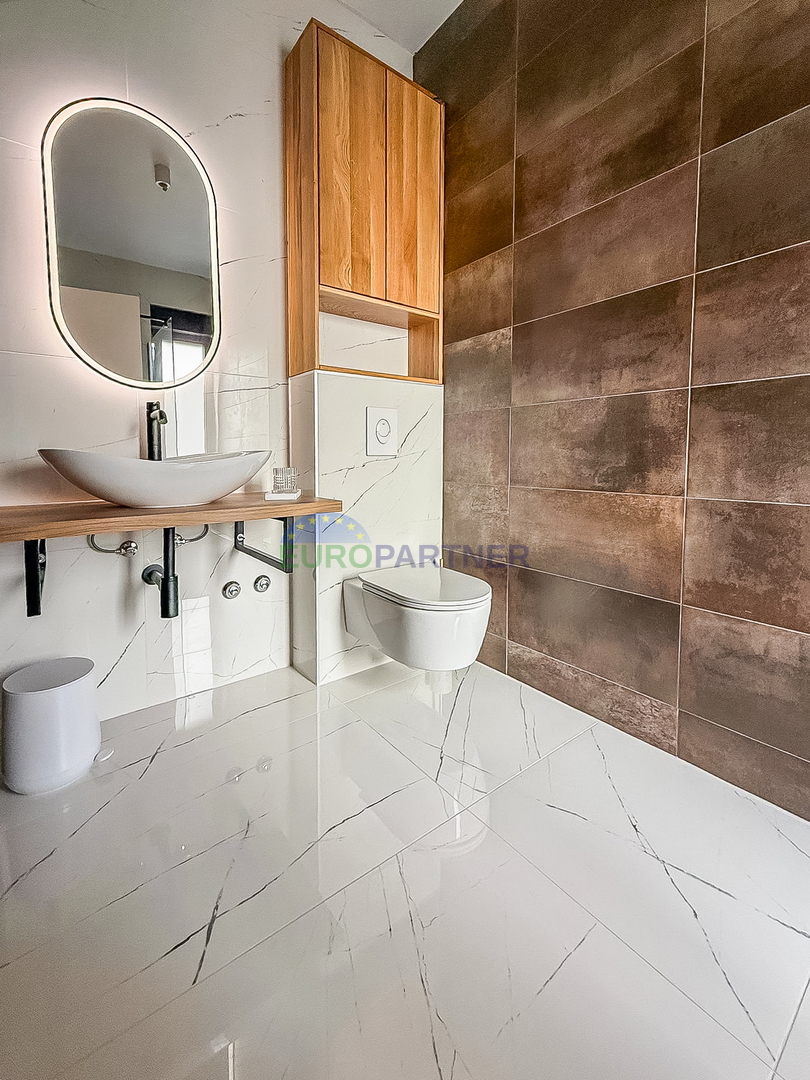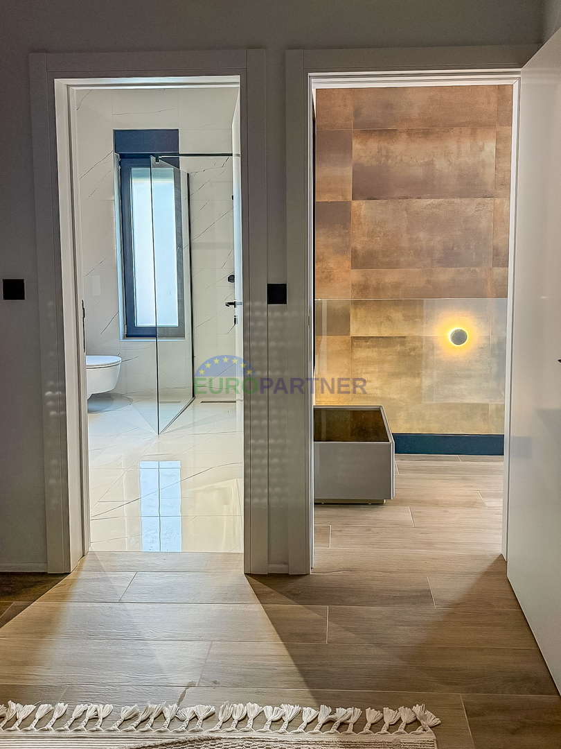Upstairs there are two comfortable bedrooms, each with its own bathroom, an additional storage room and a spacious terrace ideal for relaxation. The house is fully equipped with carefully selected designer furniture that further emphasizes the elegance and modern character of the space.