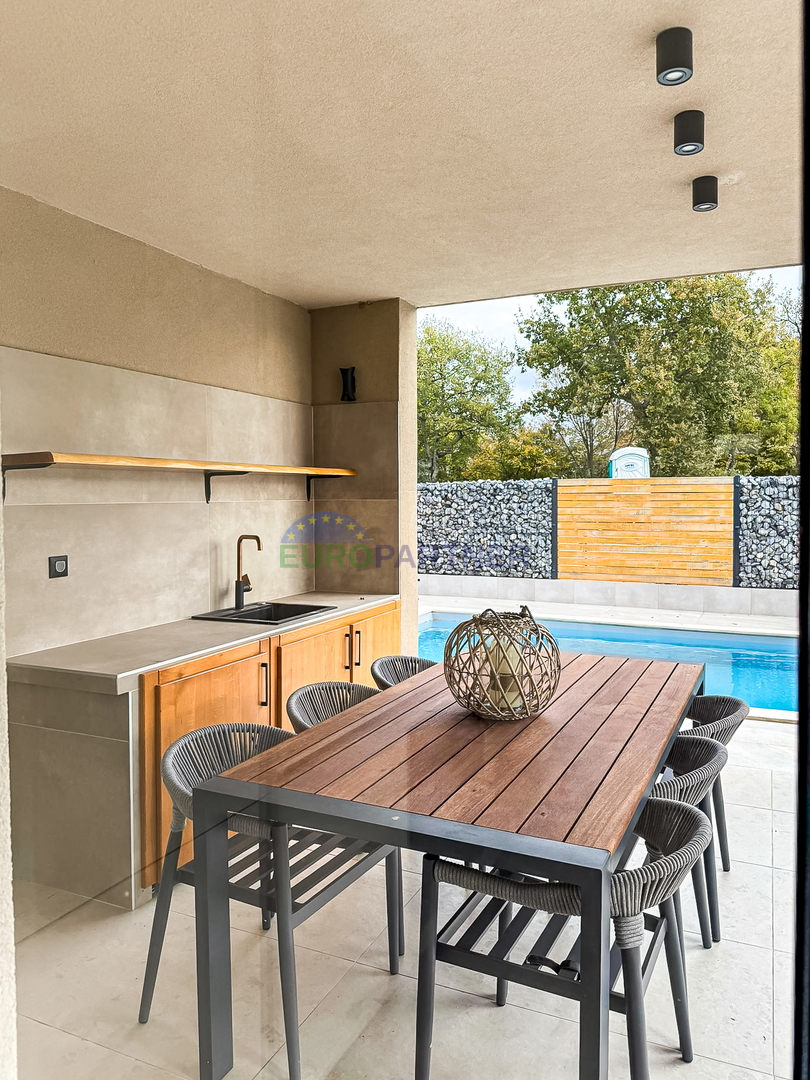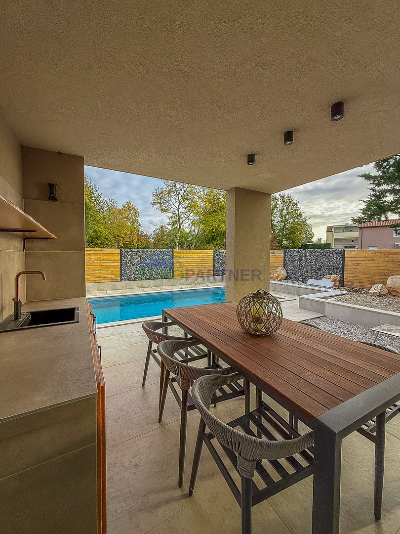 A beautiful modern prefabricated house with a swimming pool is for sale, located in a quiet location only 5 km from the center of Poreč and the sea. This attractive property is an ideal combination of modern design, functionality and a Mediterranean lifestyle.